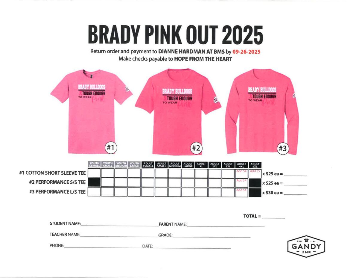 Get ready to show your support and raise awareness for an amazing cause! Swing by BMS to grab your order forms. The last day to order your Pink Out T-shirts is September 28th. We accept cash and checks only, and checks should be payable to "Ol’Houn' Dawgs". Mark your calendars, as Pink Out Merchandise will be available for purchase starting October 1st at BMS.