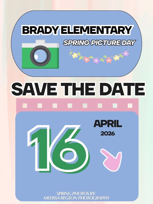 Brady Elementary Spring Picture Day is coming up! Mark your calendars for April 16, 2026 and get ready for spring photos.More information will be sent home with your student approximately one week ...